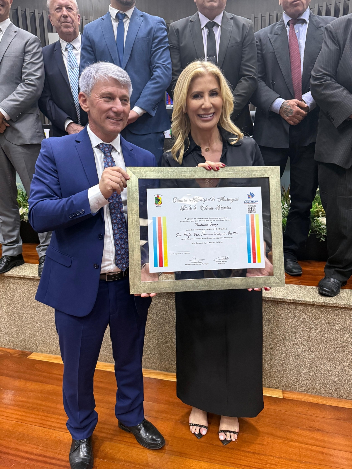 A professora doutora Luciane Bisognin Ceretta, atual secretária de Estado da Educação de Santa Catarina, recebeu o Título de Cidadã Honorária Araranguaense, honraria concedida por meio do Projeto de Decreto Legislativo nº 002/2026, de autoria do presidente da Casa, vereador Paulinho Souza.