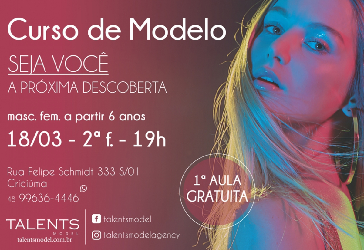 Venha participar da palestra de abertura do curso de modelo, é dia 18.3 - 19h - na sede da agência Rua: Filipe Schmidt, 333 sala 01 Torre Sophia em Criciúma SC.
