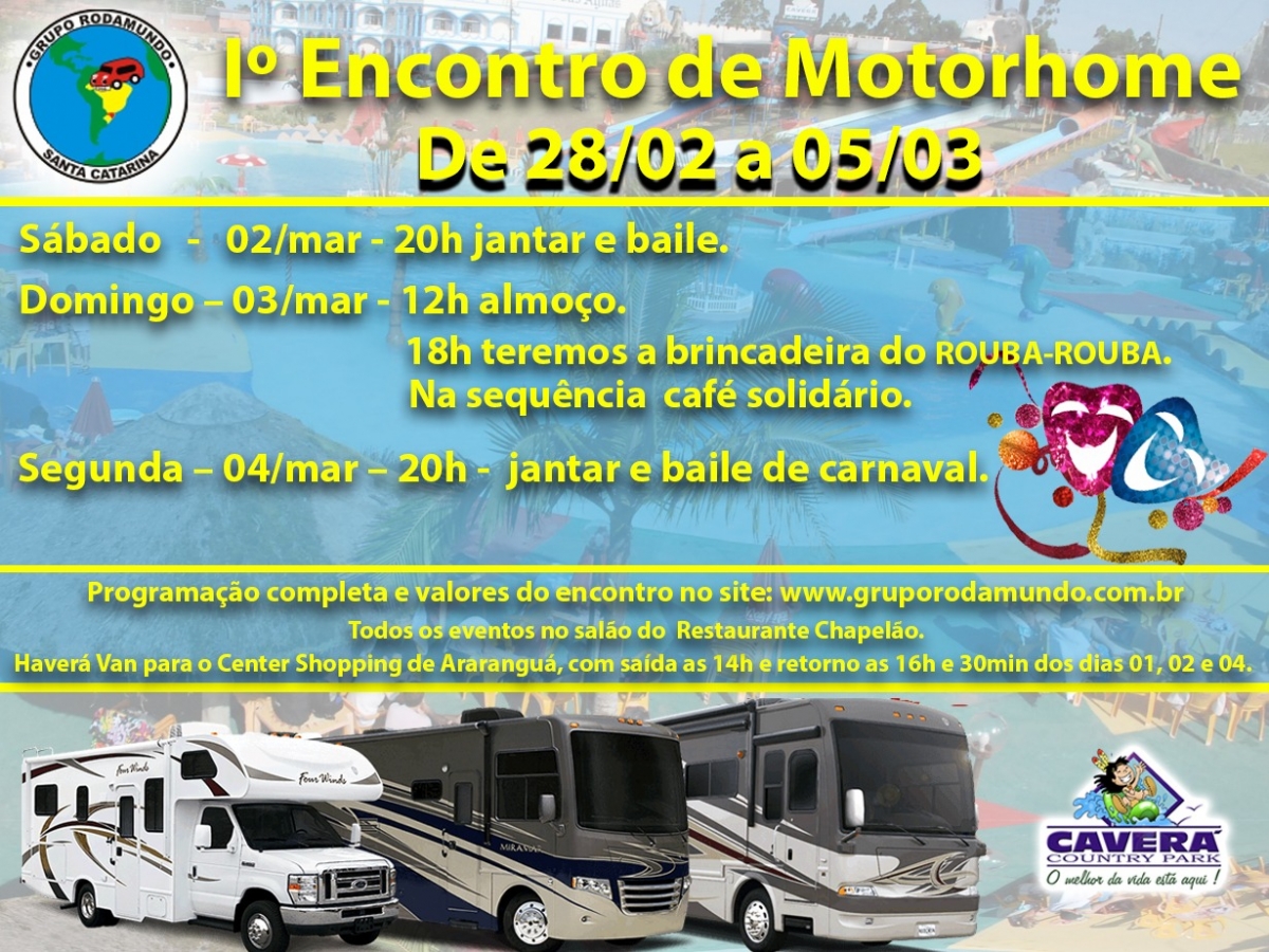 De acordo com a programação do Encontro, as vans tem saída do evento nos dias 01, 02 e 04, às 14h rumo ao Center Shopping e retornarão às 16h30min ao Caverá. O Encontro de Motorhome conta com jantar e baile de carnaval, almoço, gincanas e muito mais. Para conferir mais detalhes, basta acessar o site (www.gruporodamundo.com.br).