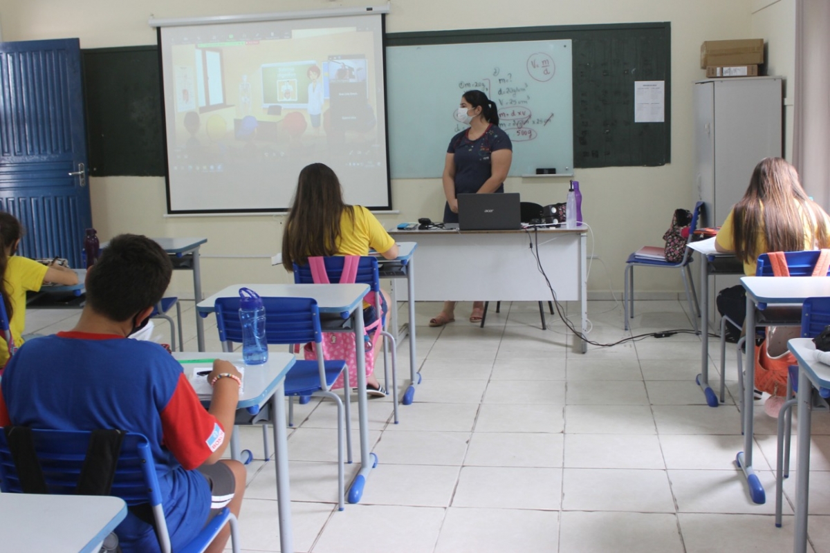 Suzana Mezzari, professora de uma das turmas, diz que já vinha fazendo uso de materiais digitais para programar as aulas antes mesmo da pandemia e que a necessidade de uso das tecnologias trouxe benefícios a alunos e profissionais. “Nós, educadores, estamos sempre dispostos a ajudar os colegas que encontram alguma dificuldade. Nossa preocupação seria em relação aos alunos, mas eles já encaram tudo com muita naturalidade”, explica, enquanto verifica se os alunos em sala e de casa estão atentos aos slides projetados numa tela e disponíveis também no software de videoconferência instalado em celulares, tablets ou computadores.