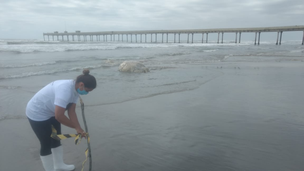 O mamífero adulto está em avançado estágio de decomposição, cód 5 área foi isolada pela Equipe da ONG Educamar.