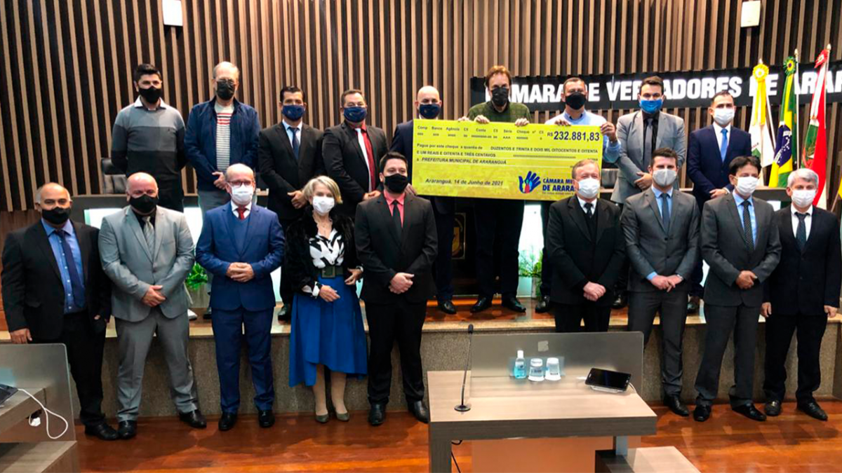 Na noite desta segunda-feira (14) a Câmara de Vereadores de Araranguá realizou uma solenidade para a devolução de recursos para o Executivo Municipal. O valor de R2.881,83 é oriundo de economias dos 15 vereadores que compõem o legislativo araranguaense.