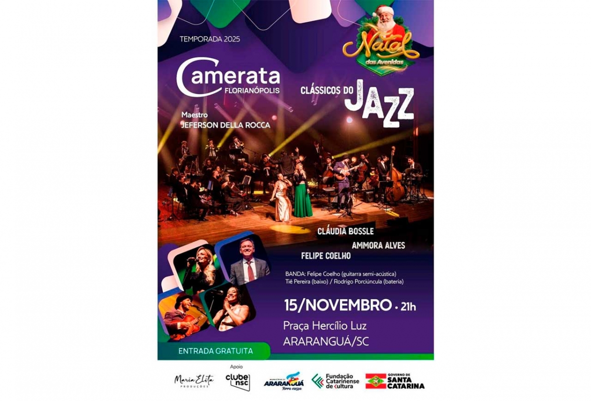 Nascido no fim do século XIX em Nova Orleans, o jazz combina liberdade, improviso e emoção. É essa atmosfera que chega a Araranguá no feriado de 15 de novembro, às 20h, com o espetáculo “Clássicos do Jazz” da Camerata Florianópolis. A apresentação, gratuita e ao ar livre, será na Praça Hercílio Luz. O espetáculo faz parte da programação do Natal das Avenidas do município.