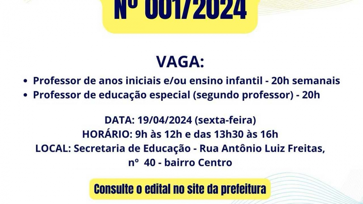 As vagas são para professor de anos iniciais e/ou ensino infantil (20h semanais); e professor de educação especial (segundo professor - 20h).