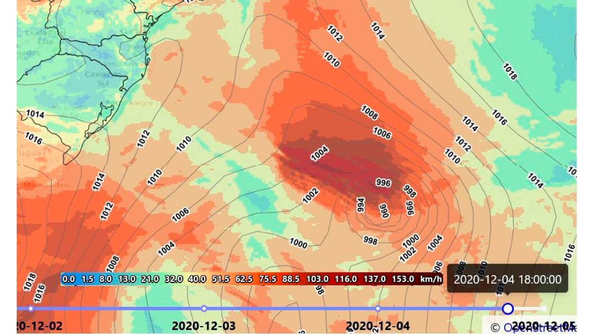 Uma área de baixa pressão atua sobre o Sul do Brasil nos próximos dias. Ainda nesta primeira semana do mês de dezembro, dá origem a um ciclone extratropical próximo ao litoral da Região Sul. A partir de quinta-feira (03) esse ciclone avança em direção ao oceano e provoca vento intenso também no litoral de São Paulo e do Rio De Janeiro.