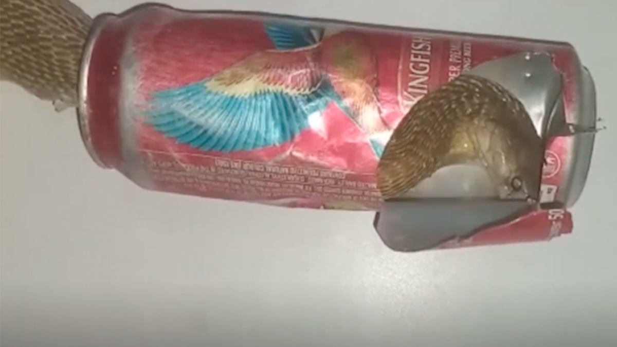 Uma cobra entalada em uma lata de cerveja viralizou na internet e acabou virando manchete na Índia. A imagem mostra o resgate do réptil, preso à latinha, depois de invadir uma casa. O animal, de cerca de um metro e meio, foi flagrado pelos moradores, depois que ouviram um barulho estranho na cozinha.