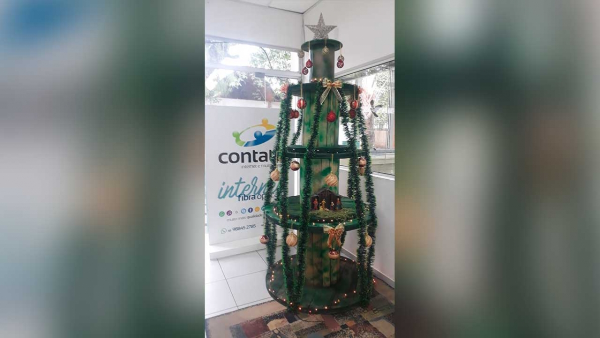 Uma boa ideia diferenciada e ecológica. Os colaboradores da Contato Internet criaram uma árvore de Natal feita com bobinas de cabos reutilizadas, pintadas de verde e enfeitadas com bolinhas, estrela, lacinhos, pisca-piscas e um pequeno presépio.