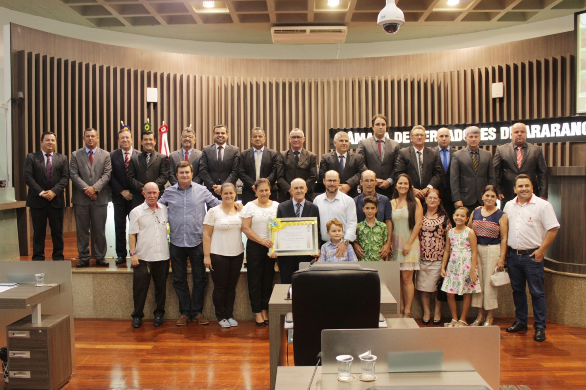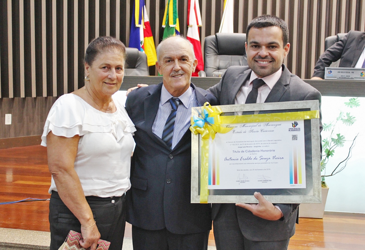 De autoria do vereador, Jorge Pereira, foi concedida pela Câmara de Vereadores de Araranguá, durante a sessão desta segunda, 25, o Título de Cidadania Honorária ao senhor Eraldo Vieira, pelo empreendedorismo e relevantes serviços prestados ao município. "Me sinto feliz e honrado por ser agora um cidadão araranguaense", disse o homenageado.