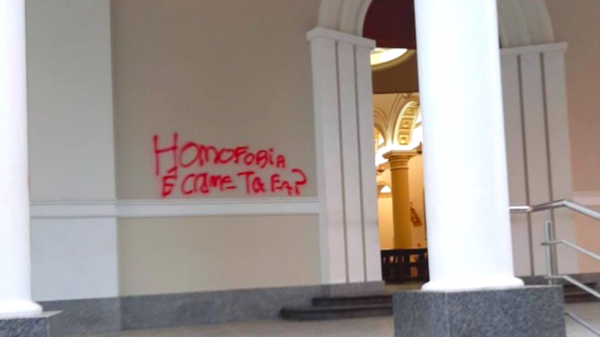 A fachada da Catedral São José na área central de Criciúma amanheceu pichada nesta quinta-feira, dia 26. A pichação se refere às falas do prefeito Clésio Salvaro, sobre a exoneração de um professor da rede municipal. O profissional teria apresentado um vídeo em sala de aula com conteúdo que o chefe do Poder Executivo criciumense considerou inapropriado.