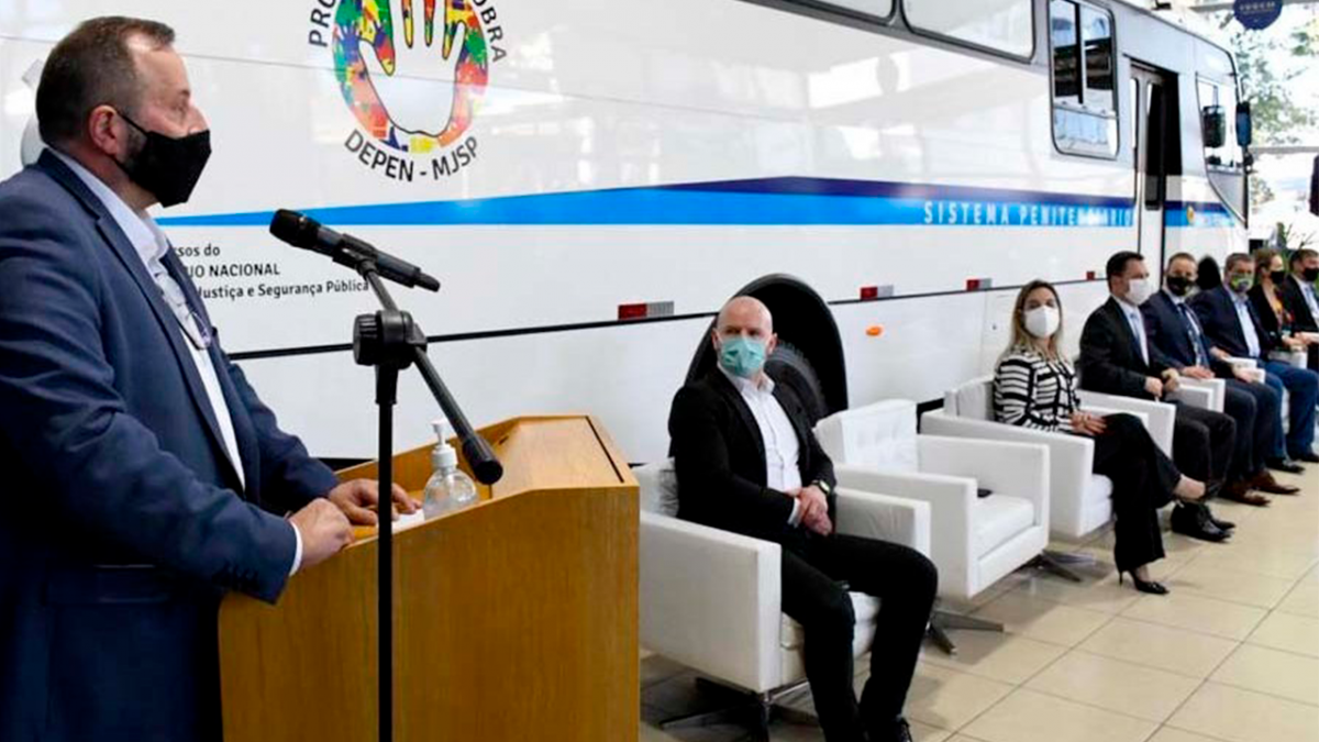 O secretário de Administração Prisional e Socioeducativa (SAP), Leandro Lima, participou nesta terça-feira, 04, do ato de entrega de ônibus adaptado ao sistema prisional, em São Paulo. Em ato simbólico, o ministro da Justiça e Segurança Pública, Anderson Torres, entregou a chave de um veículo ao secretário Leandro Lima, representando assim a destinação de 66 ônibus e 46 furgões para 21 estados, além de cinco penitenciárias federais. Santa Catarina irá receber dois ônibus para o transporte de presos.