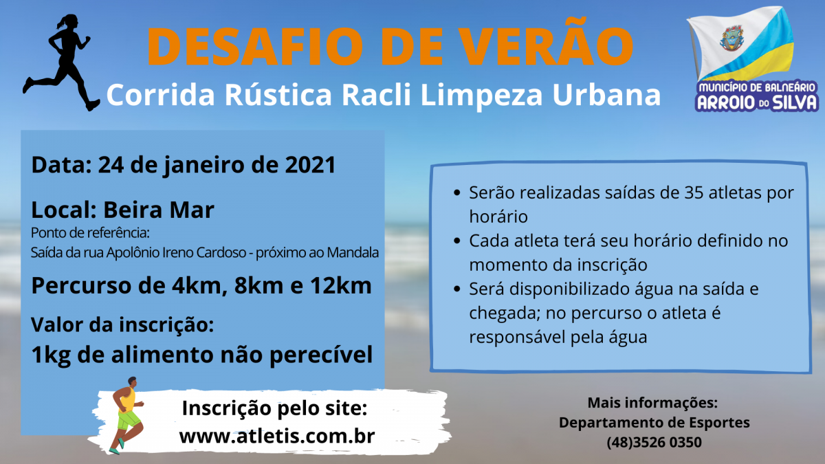 Com o objetivo de incentivar a prática esportiva, o município de Balneário Arroio do Silva organiza a Corrida Rústica Racli Limpeza Urbana - Desafio de Verão. Em virtude da pandemia, a ação será readequada. Por isso, o desafio será individual e a saída terá horários alternados para evitar aglomeração.