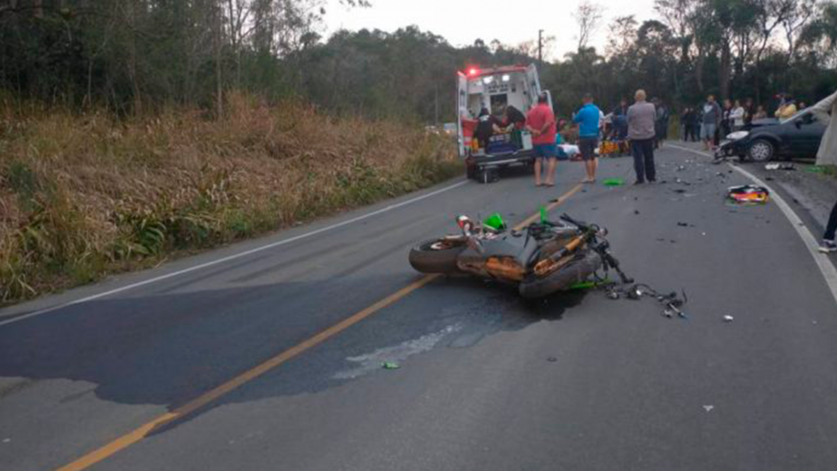 O acidente de trânsito envolvendo uma motocicleta e um carro aconteceu, neste domingo, 15, na Rodovia Silvio Morelli.