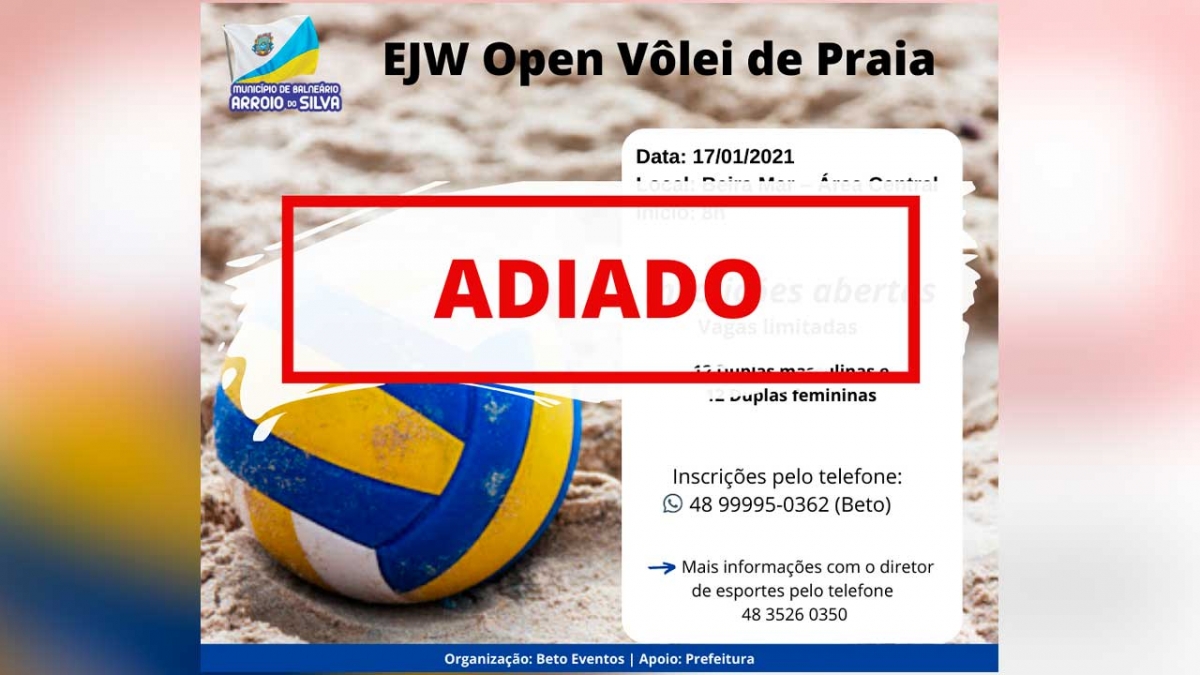O departamento municipal de esportes informa que, em virtude da bandeira vermelha na região do Extremo Sul Catarinense - que apresenta risco potencial gravíssimo para transmissão do novo coronavírus, o EJW Open Vôlei de Praia que seria realizado neste domingo (17) foi adiado. As duplas inscritas serão informadas e tão logo se estabilize, uma nova data será anunciada.