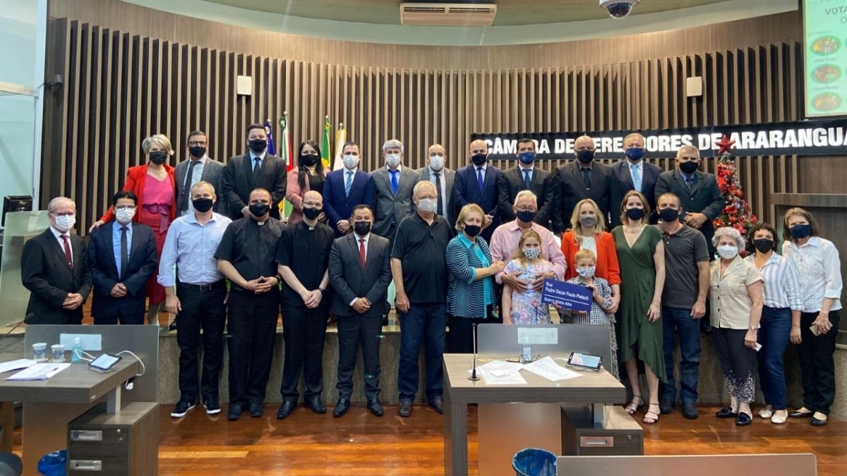 Foi aprovado por unanimidade na Câmara de Vereadores de Araranguá o Projeto de Lei 088/2021 de autoria do vereador Jair Arcenego Anastácio (PT), que denomina Rua Padre Oscar Paulo Pietsch a atual Rua G, localizada no loteamento Eldorado no bairro Mato Alto em Araranguá.