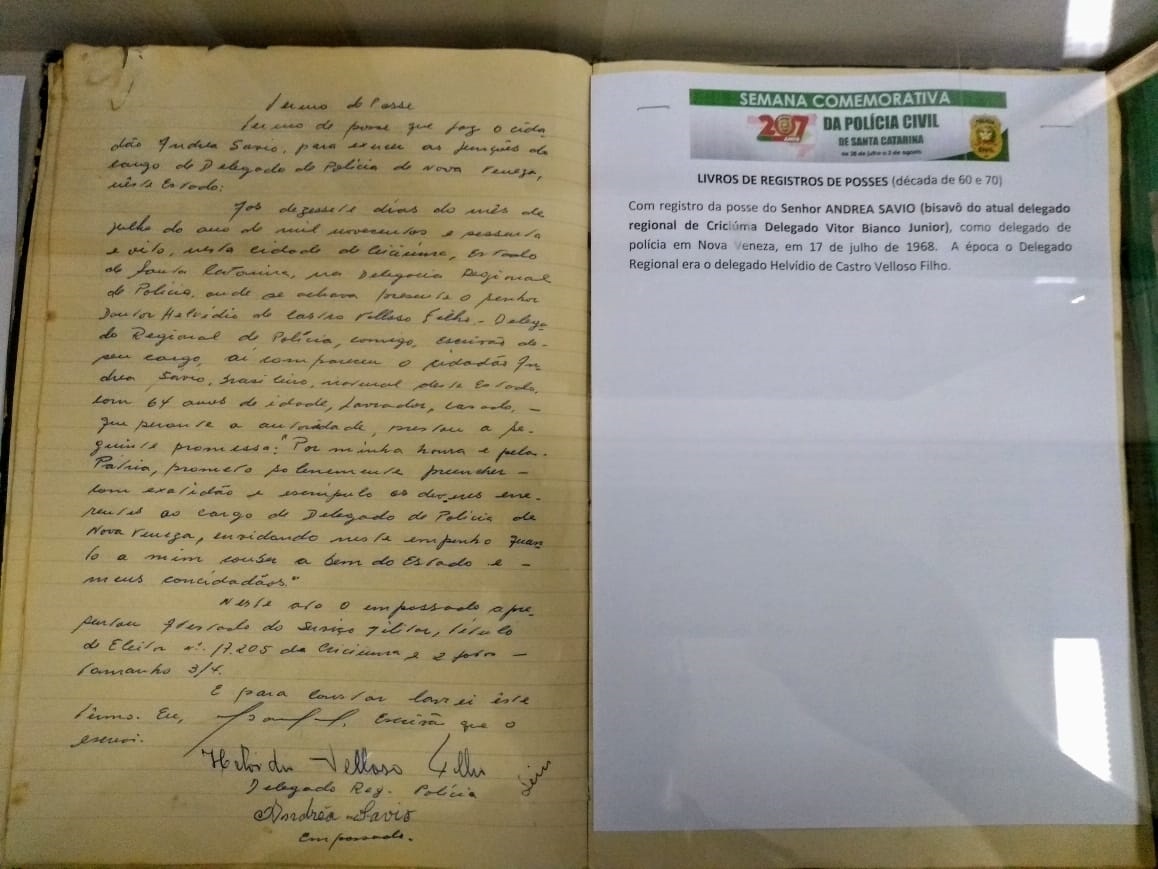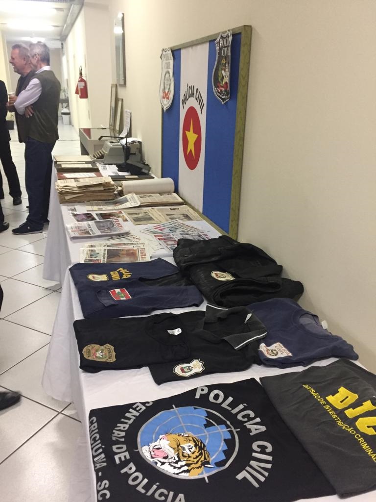 Entre os itens expostos estão livros de registros de “queixa” manuscritos, outros de posse dos policiais, máquina de escrever, uniformes antigos, recortes de jornais e a primeira bandeira da Polícia Civil. O garimpo dos itens históricos foi feito pelo agente Arilson Carlos Nazário. Para ele, a pesquisa foi como “redescobrir a instituição e suas origens”. O policial enaltece que a exposição é para valorizar aqueles que, por conta dos recursos de sua época, fizeram uma bela história da Polícia Civil de Santa Catarina.
