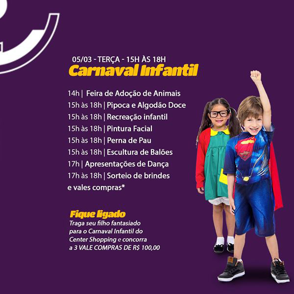 *Traga seu filho fantasiado para o Carnaval Infantil do Center Shopping e concorra a 3 vales-compras de R$ 100,00.