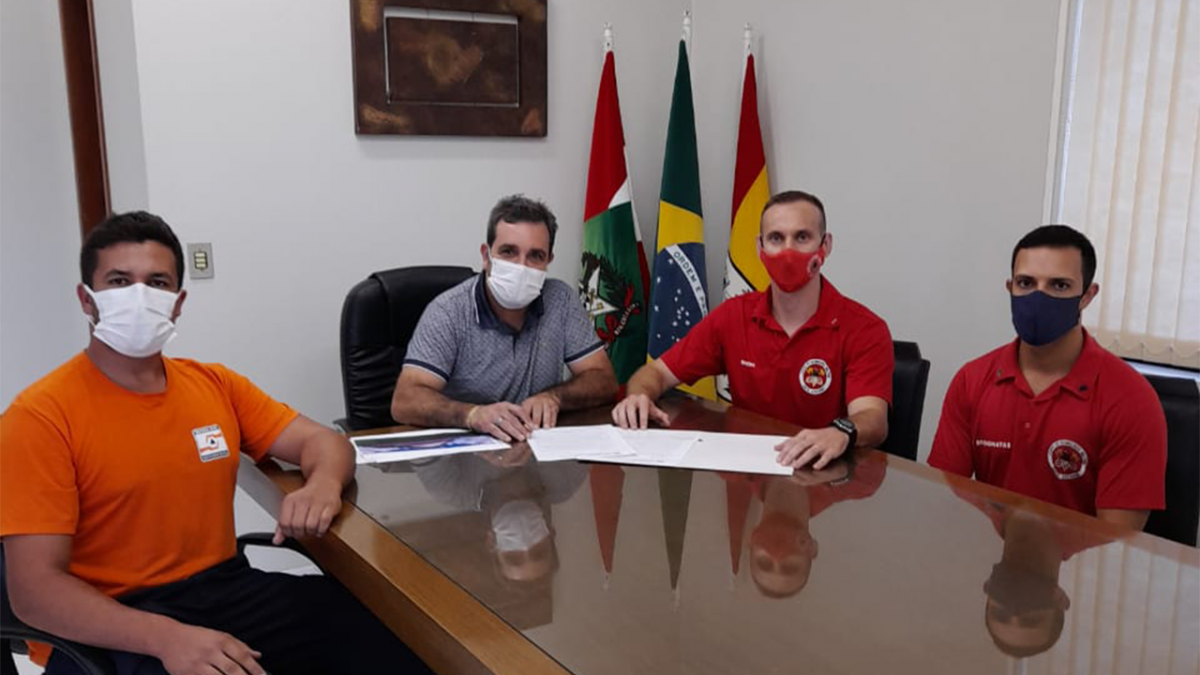 Estavam presentes na assinatura, o Prefeito Almides da Rosa, o Comandante do Corpo de Bombeiros Tenente Bianchi, Sargento Dionatas e o atual coordenador da Defesa Civil do Município Higor Pereira.