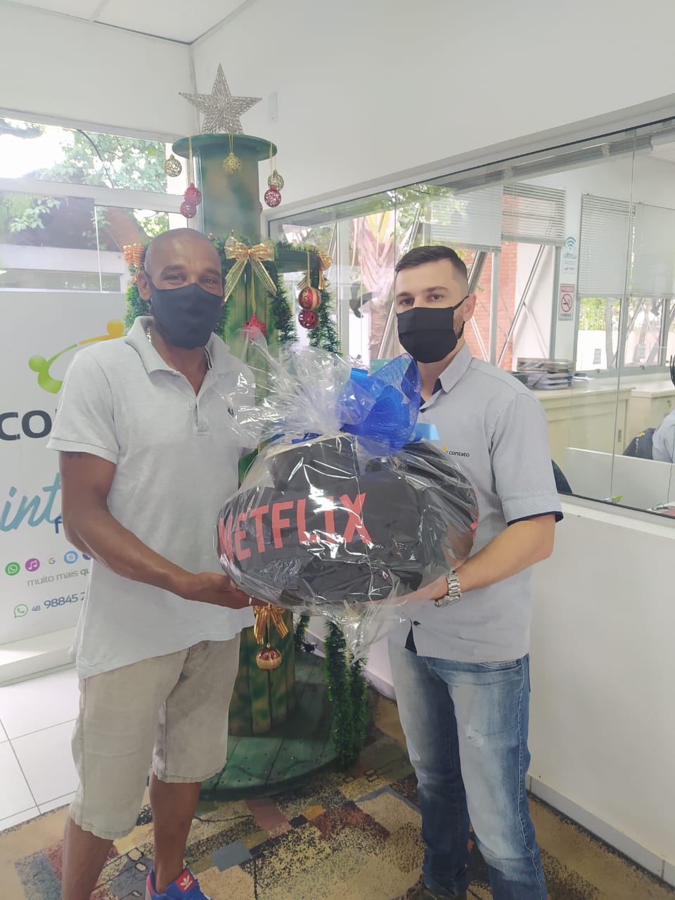 Neste mês, o cliente Mauro Antônio dos Santos Nobre, de Araranguá, foi o ganhador do Kit Cinema, que contém pipoqueira, almofada para pescoço, almofada de pipoca com um balde e dois copos e gift card da Netflix, para o cliente assistir filmes e séries no conforto de casa. A entrega do prêmio foi realizada pelo consultor de vendas, Luan Gomes de Campos.