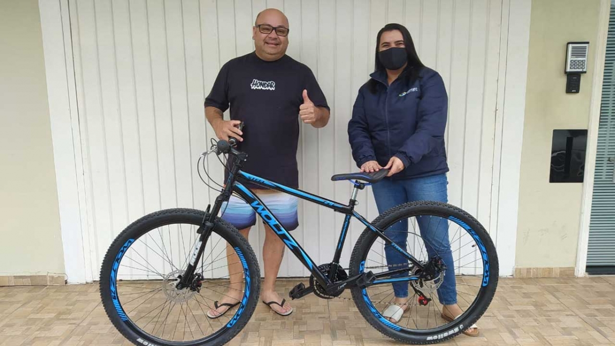 O cliente Rafael Schmidt, de Tubarão, foi o sortudo de outubro e ganhou uma bicicleta Aro 29. O prêmio do ganhador foi entregue pela consultora de vendas, Daniela de Araújo, ao primo do sorteado, Adriano Franken.