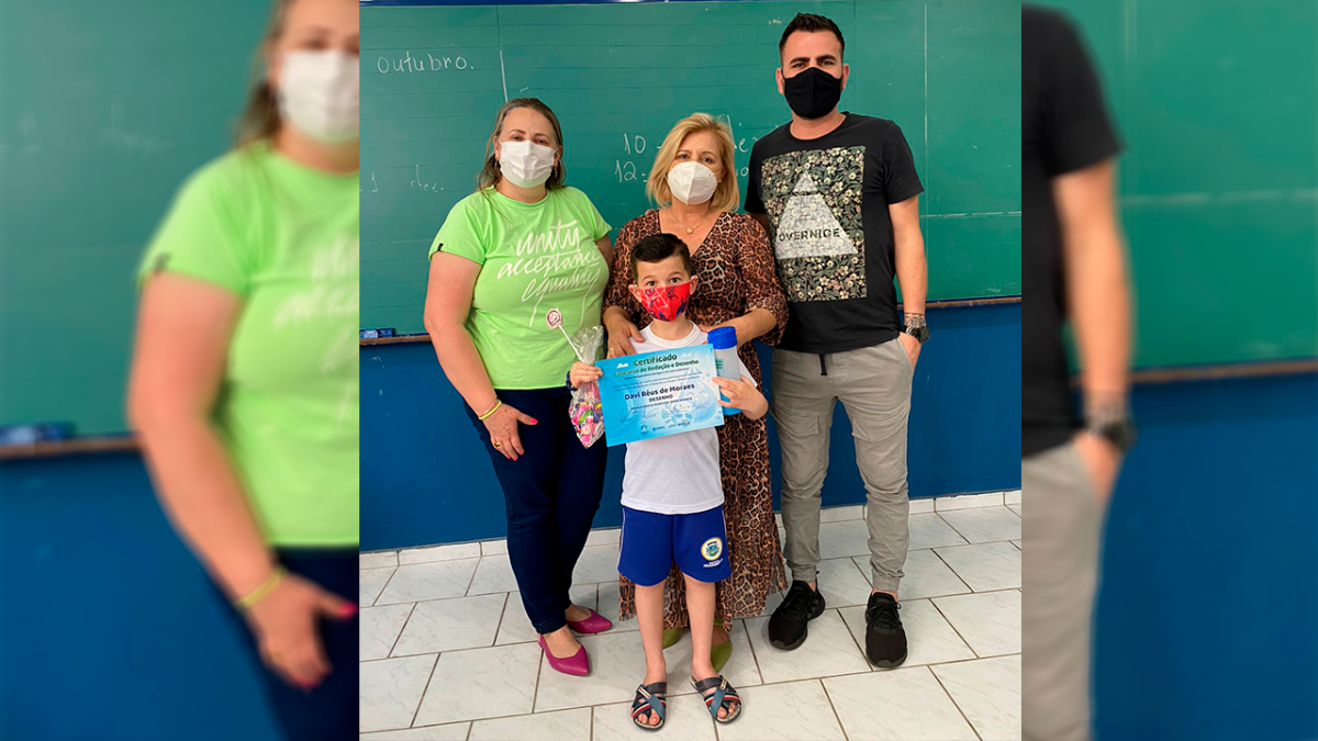 Já na entrega, o estudante do 1º ano, Davi Réus de Moraes, recebeu a condecoração ao lado da diretora Márcia Timboni, da professora Daule Leite e do auxiliar de direção Maikon Borges, todos da EBM Nova Divinéia.
