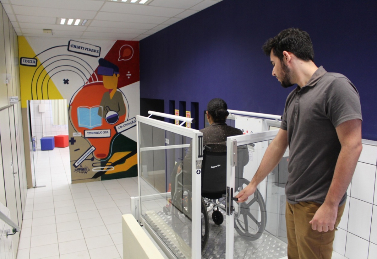 Quem chega ao Cocreation e à Sala de Metodologias Ativas já percebe algumas mudanças. Uma plataforma elevatória foi instalada para quem necessita deste meio para mobilidade. O piso no prédio 17 agora é com piso tátil para quem possui baixa visão. Já as maçanetas das portas foram adaptadas.