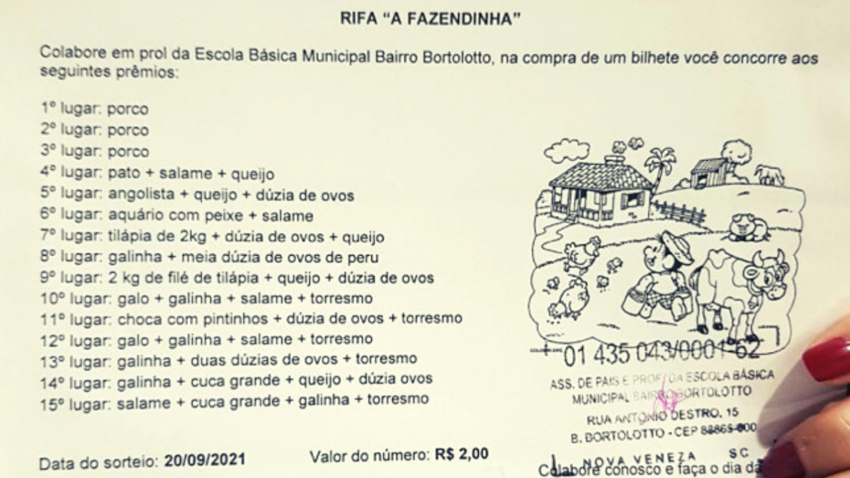 A lista é uma premiação da rifa “A Fazendinha”, da Escola Básica Municipal Bairro Bortolotto, de Nova Veneza. Todos os itens foram doados por famílias da comunidade e seguem a temática rural.