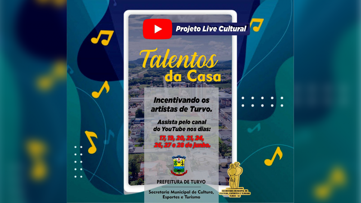 Pensando nisso, o município de Turvo criou o projeto cultural “Talentos da Casa”, a fim de incentivar, apoiar e valorizar os artistas locais. Através do canal da Prefeitura no Youtube, a população poderá acompanhar em determinadas datas agendadas, oito lives culturais que serão transmitidas ao vivo do Centro de Eventos.