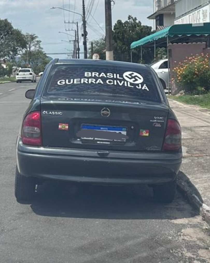 Um veículo com adesivos contendo a frase “Brasil guerra civil já” e o símbolo da suástica foi visto na manhã desta quinta-feira(22) circulando e estacionado em via pública de Araranguá. A imagem foi registrada por moradores e rapidamente passou a circular nas redes sociais, causando preocupação e repercussão na comunidade.