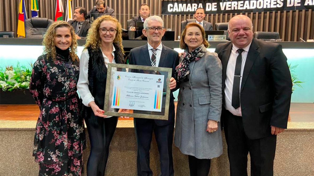 O Poder Legislativo Municipal aprovou um Projeto de Decreto Legislativo de autoria do vereador Luciano Pires (Podemos) que concede título de cidadania honorária para Aldomir Sílvio Jerônimo, que possui 78 anos e conta uma vida dedicada ao desenvolvimento de Araranguá, por meio de seu serviço na área de engenharia agrônoma.