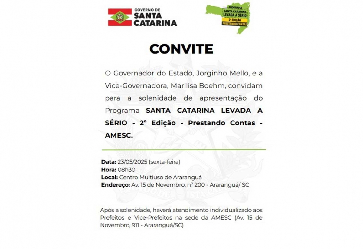 O governador de Santa Catarina, Jorginho Mello, estará em Araranguá na próxima quinta-feira, dia 23 de maio, para cumprir agenda oficial no município. A visita está marcada para às 8h30 no Centro Multiuso, localizado no bairro Cidade Alta.