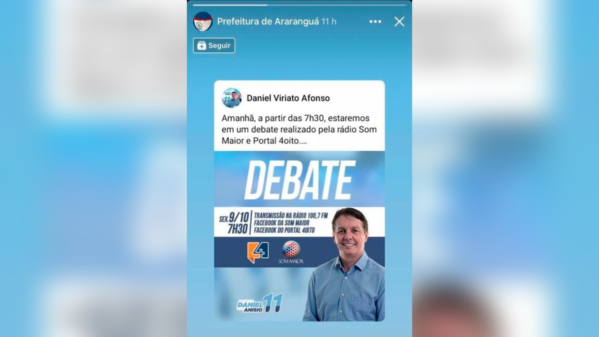 A Coligação “Novos Rumos Araranguá”, por intermédio dos mesmos advogados, conquistou liminar contra a chapa dos candidatos a prefeito e vice, Daniel Viriato Afonso (PP) e Anisio Premoli (PDT), respectivamente, devido a divulgação, nas redes sociais da Prefeitura de Araranguá (foto) de um convite para o debate eleitoral realizado em uma emissora de rádio de Criciúma.A postagem já foi excluída, porém uma investigação judicial vai averiguar o mérito dessa atitude, que pode resultar em aplicação de multa, ou até em cassação do registro da referida candidatura.
