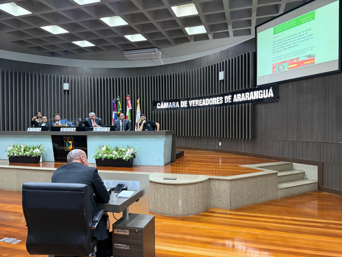 Durante sua manifestação, o vereador apresentou uma reportagem recente exibida em telão, que retrata um caso de feminicídio ocorrido na mesma data, envolvendo municípios do sul catarinense. Ao comentar o episódio, demonstrou preocupação com a recorrência desse tipo de crime e com a escalada dos índices. “O índice de feminicídio só aumenta, e por incrível que pareça, estados como Santa Catarina e Rio Grande do Sul lideram esses números. As mulheres estão apavoradas”, afirmou.