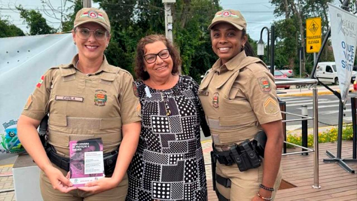 Durante a ação, as policiais do Rede Catarina estiveram presentes para dialogar com a população, promover a reflexão e dar visibilidade ao trabalho de prevenção realizado pela PMSC no contexto da violência doméstica.