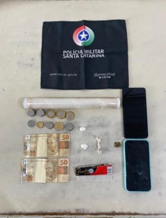 Durante as buscas no interior do imóvel, os policiais localizaram porções de drogas e materiais utilizados para o preparo e comercialização de entorpecentes. Foram apreendidos 2,3 gramas de cocaína, 1 grama de maconha, 1,64 grama de crack, além de R$ 121,00 em dinheiro, um rolo de plástico filme e uma embalagem de seda para cigarros.