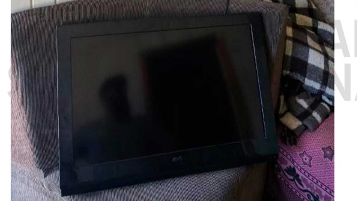 E em cima de um sofá estava uma televisão fora do suporte afixado na parede.