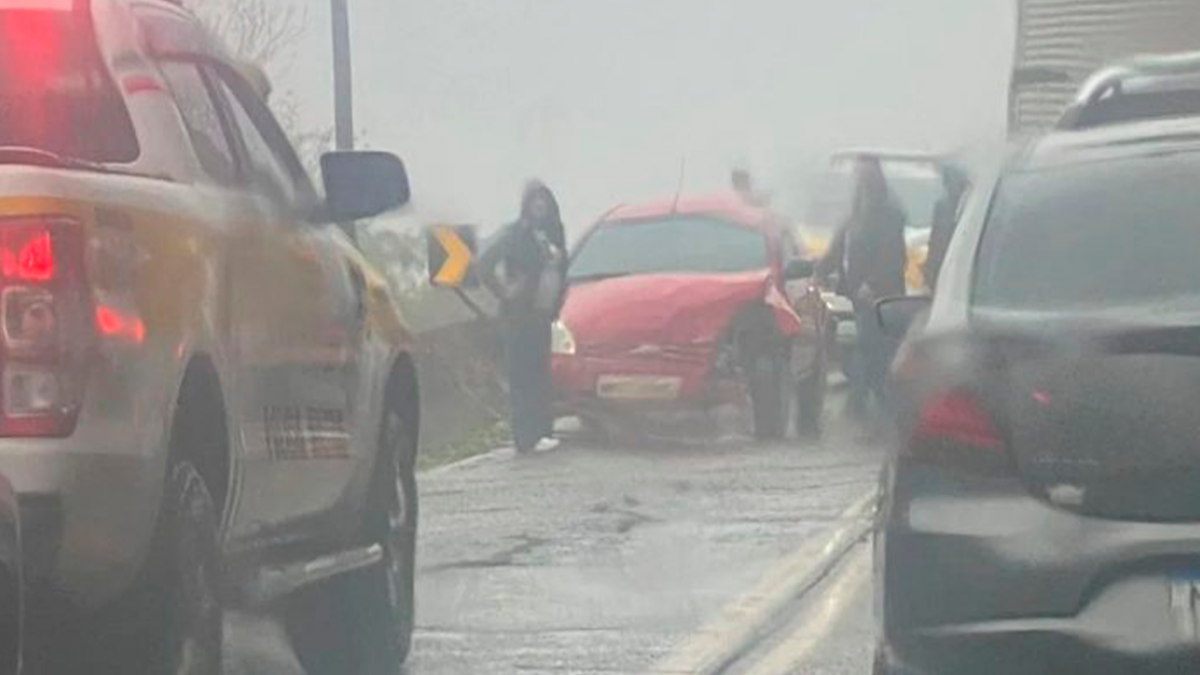 Um acidente de trânsito foi registrado no início da tarde desta terça-feira, 19, na Serra do Rio do Rastro. Na imagem, o Ford Ka vermelho aparece com a frente danificada, juntamente com uma neblina densa, o que indica ser uma das causas do acidente.