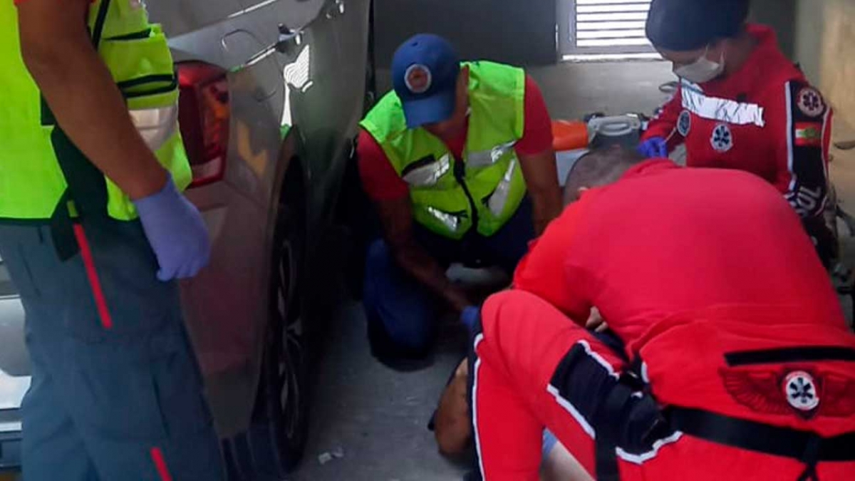 Ele teve sua queda amortecida pela estrutura da garagem e um carro.