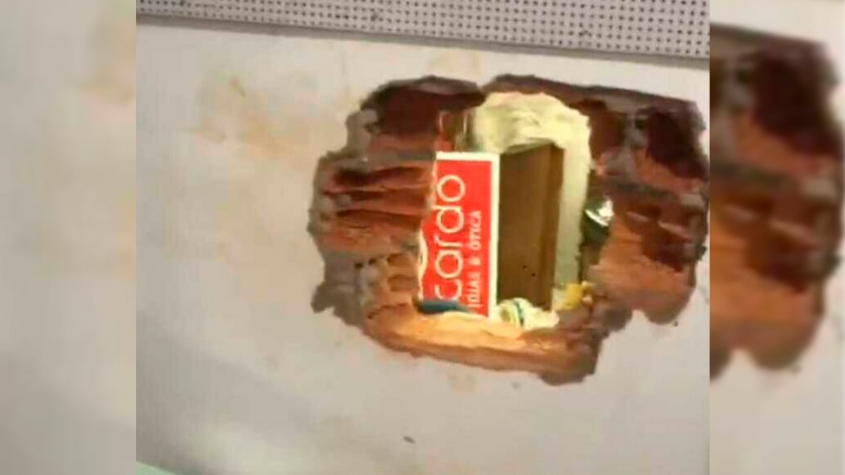 O dono da loja, ao chegar para trabalhar, percebeu que uma das paredes estava arrombada e com o cofre aberto. Ouro, joias e dinheiros foram furtados