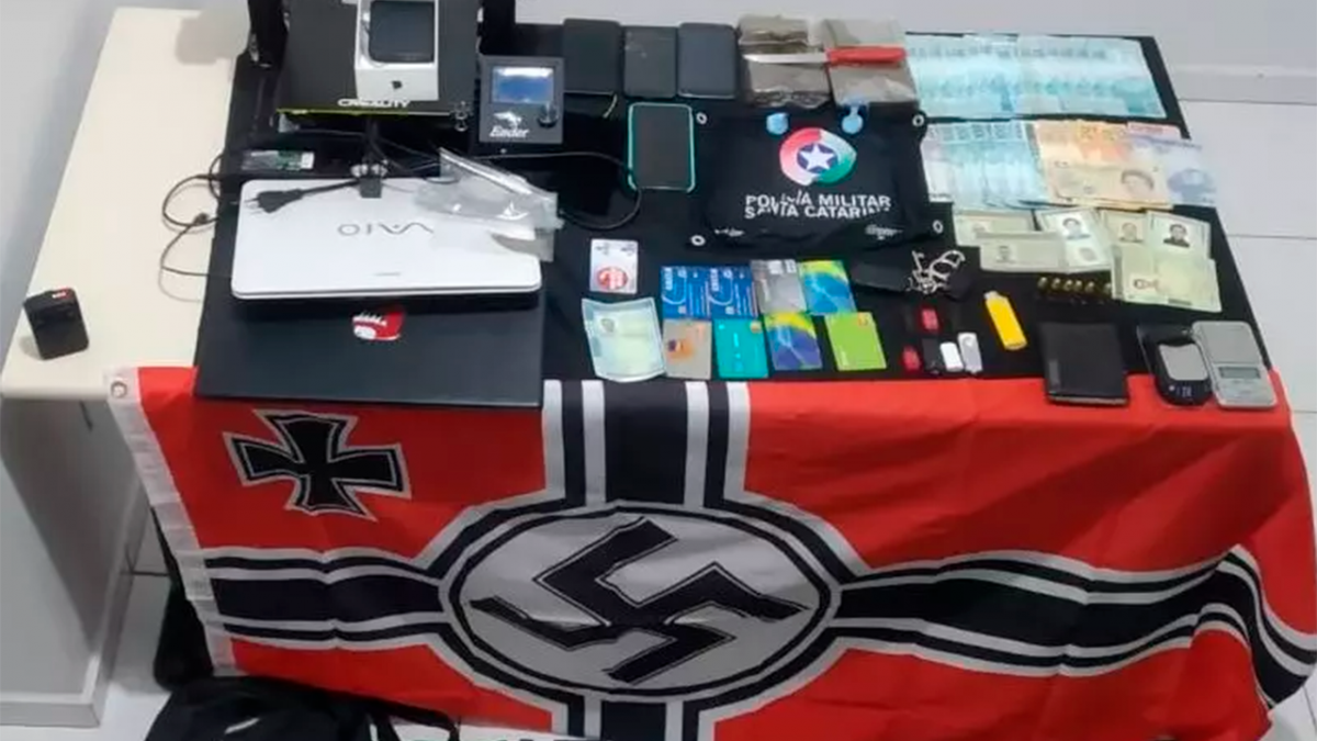 Também foi apreendido no local uma bandeira com símbolo do Nazismo e outra do “Kekistan” (usada em fóruns de jogos), dois notebook, pen drives, diversos cartões de bancos, cadernos com anotações e uma apostila de curso de russo. Os envolvidos foram presos e o material apreendido.