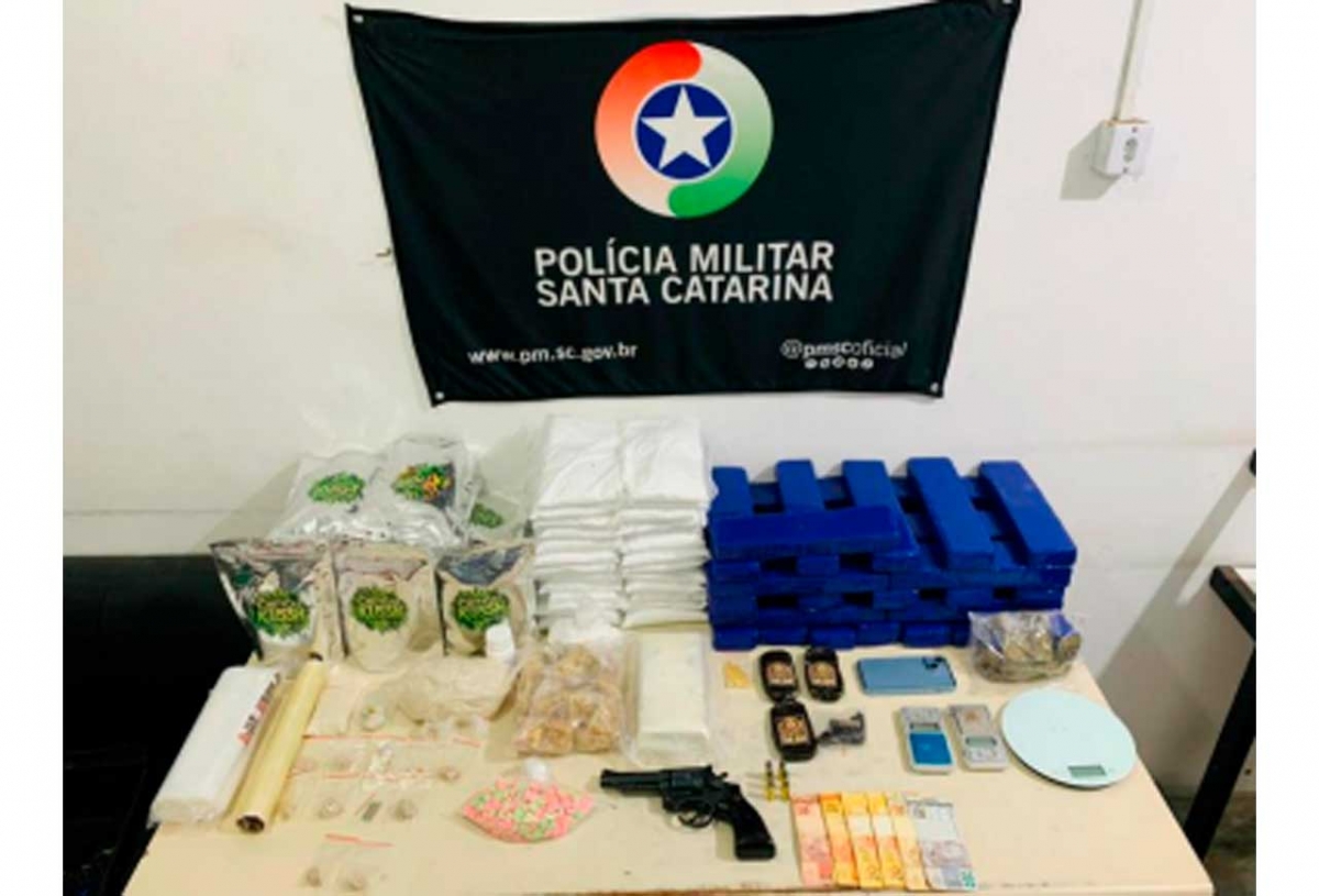 O homem tentou correr para dentro da casa, porém foi alcançado e abordado. No interior do imóvel, os policiais encontraram um amplo estoque de drogas e materiais relacionados ao tráfico. No total, foram apreendidos: