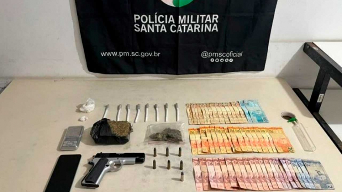 Um homem foi preso após a Polícia Militar (PM) encontrar drogas, dinheiro, um simulacro, balança de precisão e em uma casa no bairro Araçá, em Jacinto Machado.
